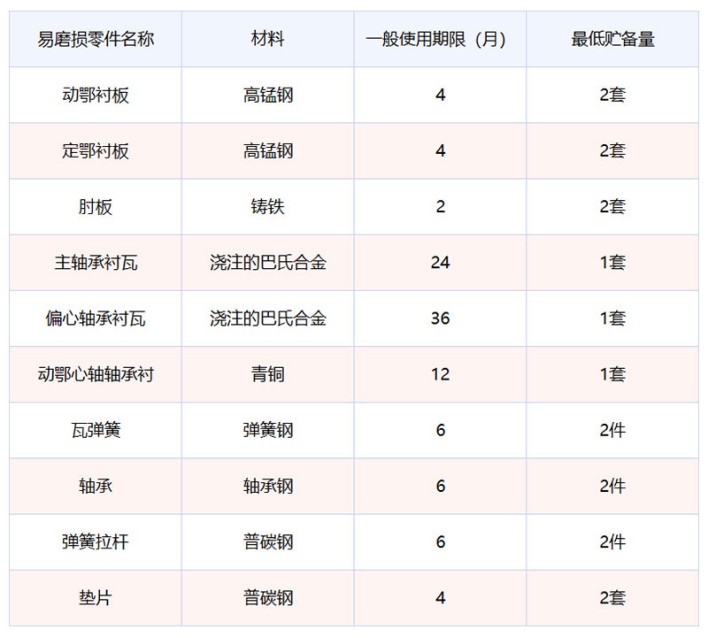 顎式碎石機(jī)的易損件使用壽命是眾多客戶(hù)都十分關(guān)心的,紅星廠家以用戶(hù)需求為生產(chǎn)起點(diǎn),以品質(zhì)為追求,在顎破設(shè)備的制造上下足功夫,動(dòng)鄂襯板、定鄂襯板均采用耐磨損的高錳鋼,主軸承襯瓦、偏心軸承襯瓦采用澆注的巴氏合金,肘板采用鑄鐵材料……更多材質(zhì)及使用壽命請(qǐng)看下表,可供用戶(hù)進(jìn)行參考。(注:實(shí)際使用壽命以個(gè)人為準(zhǔn))