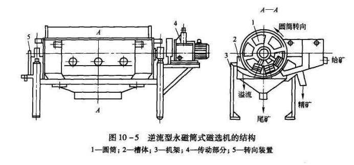 它主要由磁系、圓筒、分選槽、傳動(dòng)裝置、以及給料、排料和溢流裝置組成。