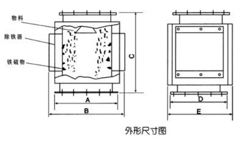 物料經(jīng)過本除鐵器時,經(jīng)除鐵器中心分流板把物料分流到管道除鐵器的磁場覆蓋區(qū),鐵磁性物質(zhì)被吸附在管道壁上,清除鐵磁性物時打開側(cè)門,把鐵磁性物質(zhì)取出即可。
