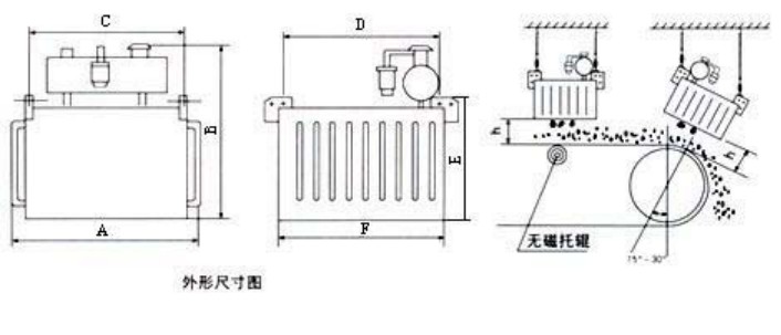| 型號 | 項目 → | 適應(yīng)帶寬 | 額定吊高 | 磁場強度 | 適應(yīng)帶速 | 物料厚度 | 勵磁功率 | 重量 | 外形尺寸mm | ||||