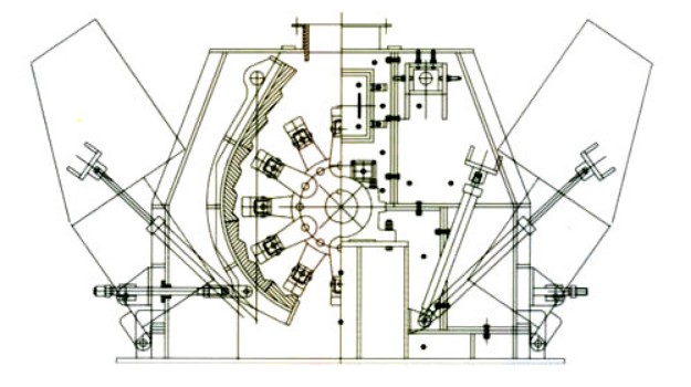 在PCXK可逆式防堵細碎機的中央布置有轉子,轉子帶動錘頭作高速圓周運動,對稱于轉子兩側有可調節的破碎齒板,破碎齒板可隨側蓋作開放性打開,特殊設計的齒板與錘頭的運動軌跡構成破碎腔,從進料口處落下的物料,首先被高速旋轉的錘頭擊向破碎齒板,隨即又被齒板反彈向向錘頭或其它破碎齒面,物料在破碎腔中如此來回跳動,并在運動過程中相互碰撞,被進一步擊破,達到設計粒度的物料從破碎機底部的出料口排出。出料粒度可由調節機構調整控制。